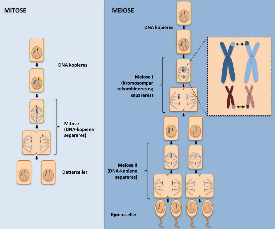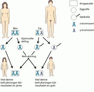 I hver enkelt celle finnes det 46 kromosomer (diploide), som danner 23 kromosompar. Hvert kromosompar har ett kromosom fra mor og ett kromosom fra far. Unntaket er kjønnskromosomene som kun består av 23 kromosomer. Om vi blir en gutt eller jente avgjøres når kjønnskromosomet fra mor (23 kromosomer som ligger lagret i egget) smelter sammen med kjønnskromosomet fra far (23 kromosomer som ligger lagret i sædcellen) til en ny celle som består av 46 kromosomer, fordelt på 23 kromosompar.